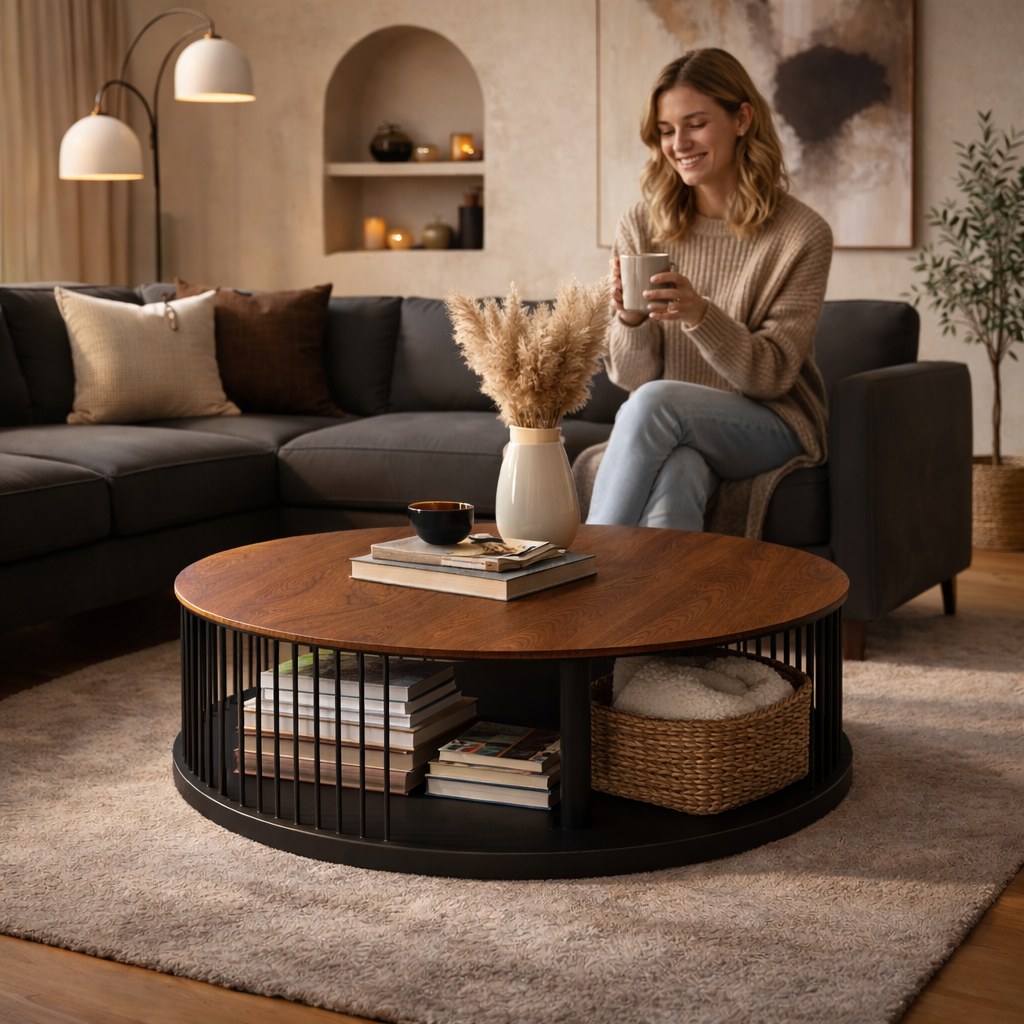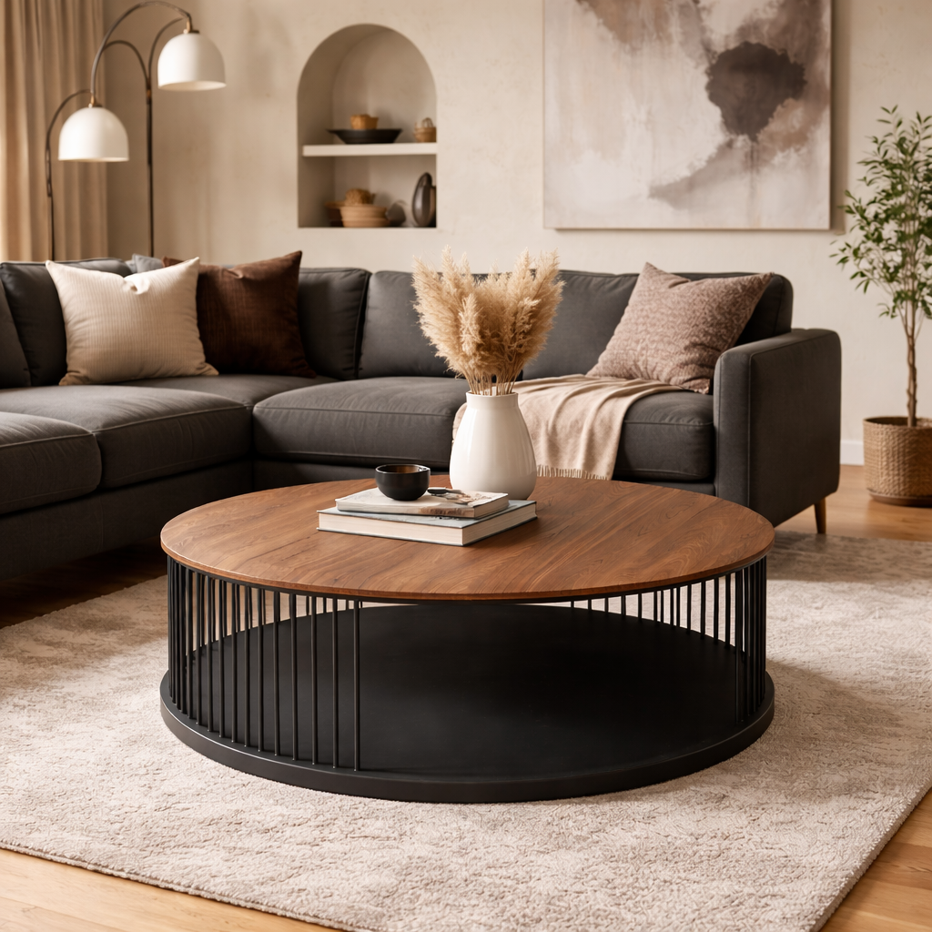 Jemná kresba dreva a ľahkosť kovovej konštrukcie vytvárajú stolík, ktorý funguje ako dominantný aj doplnkový prvok.